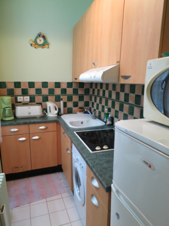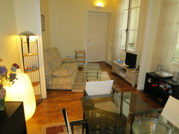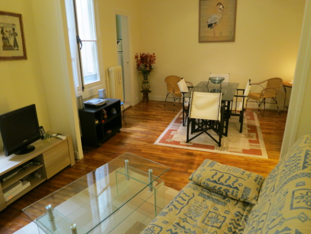 The one-bedroom apartment is located in Saint Germain. The living room is comfortably furnished with a sofa, armchair, and TV, and a separate dining area with a table and chairs. The kitchen has modern appliances and everything you need to cook a meal.